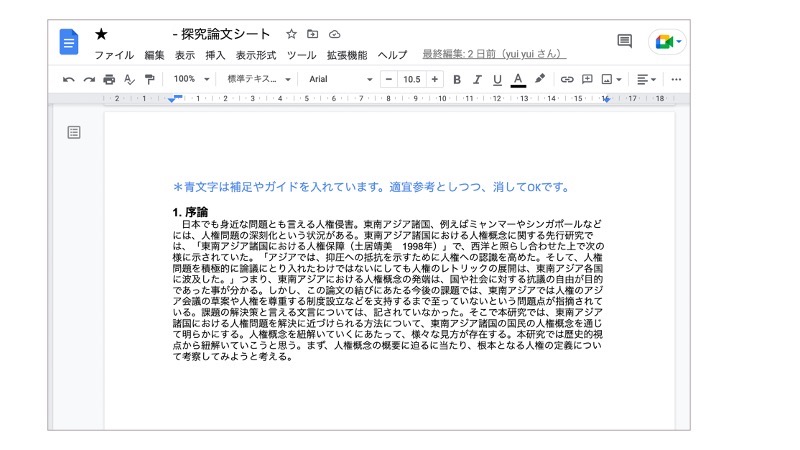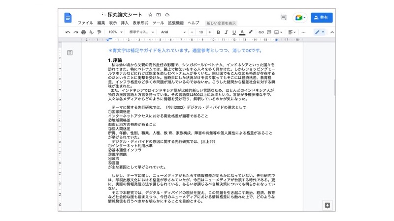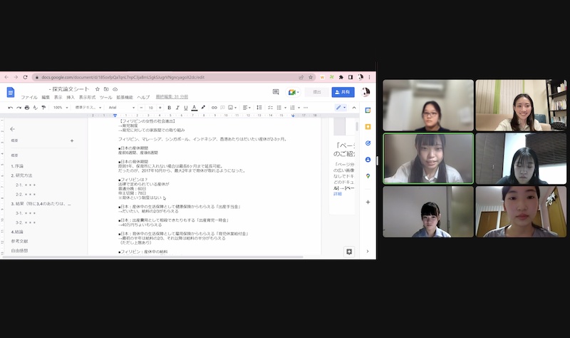設定したテーマ・リサーチクエスチョン、これまでそのテーマに対して自分なりに調べた先行研究の状況、そこから導きつつある自分の探究の方向性を、序論の構成を意識しつつ共有してもらいました。